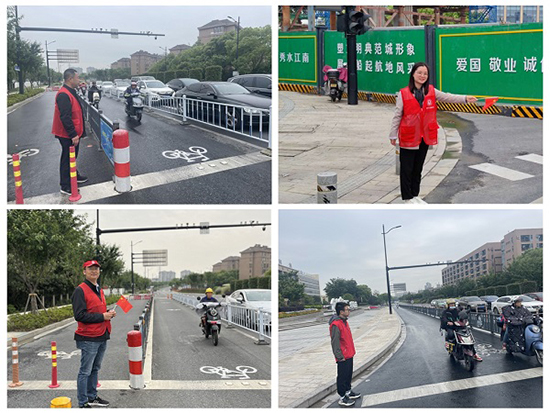 “您好,請佩戴好頭盔。”“您好,請等綠燈亮起后再通行。”在學校附近的中環北路與塘匯路口的早晚高峰時段,由匠馨黨支部于海文、宋利加、俞冰、許韜等黨員組成的志愿者隊伍協助交警維持交通秩序。他們身著志愿者馬甲,手持交通提示牌,在交警的帶領下進行文明交通勸導,糾正亂穿馬路、闖紅燈、不戴頭盔等不文明交通行為,提醒過往行人遵守交通規則,注意交通安全,引導大家自覺摒棄交通陋習、抵制交通違法行為,做文明交通的踐行者和維護者。