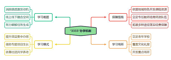 學校開創老年教育辦學“3333”的機制:一是落實課程資源、師資隊伍、經費保障三項保障措施;二是開創三處學習場所,即進文化禮堂、進老年學校、進重點場所;三是創新三種學習模式,即集中辦班、專題項目、社團共學;四是解決三個學習難題,即消除顧慮、線上線下、任務生成。