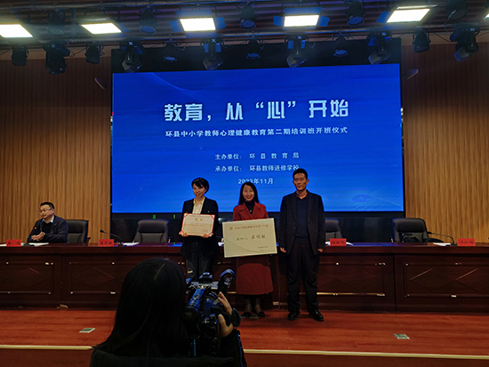 為保證“送教西行”活動持久有效地開展,甘肅省環縣教育局在環縣職業中專成立環縣中小學心理健康教育名師工作室,聘請崔明敏為主持人,工作室成員來自環縣各校心理健康教育骨干教師,環縣教育局局長為崔明敏授牌并頒發證書。