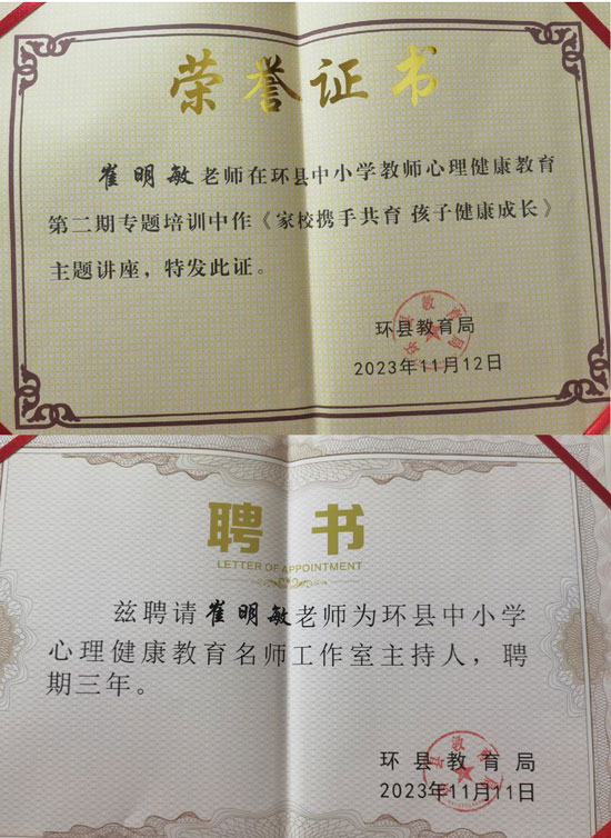 據了解,自“送教西行”公益活動開展以來,崔明敏多次與環縣中小學心理健康教育名師工作室成員通過線下研討會和線上視頻會議等形式,探討留守兒童家庭教育、輟學學生教育難題、問題學生心理輔導和轉介等議題,及時為環縣教師就送教下鄉、教師壓力管理、家長課堂、青春期性教育、班主任心理健康培訓、心理委員培訓等工作開展提供支持和幫助,賦能環縣教師在心理健康教育路上繼續前行。(浙江省德清縣職業中等專業學校)