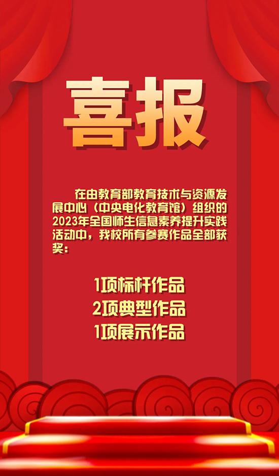 在由教育部教育技術(shù)與資源發(fā)展中心(中央電化教育館)組織的2023年全國師生信息素養(yǎng)提升實踐活動中,浙江信息工程學(xué)校·湖州工程技師學(xué)院所有參賽作品全部獲獎:1項標(biāo)桿作品,2項典型作品,1項展示作品。
