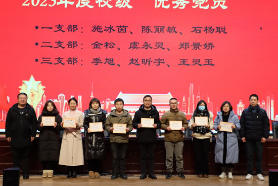 首先舉行表彰,吳德章宣讀了2023年度校“優秀黨員”、校“黨員先鋒崗”名單以及市教育系統先進推薦名單,并和黨總支書記張昌森一同為校“優秀黨員”頒獎。