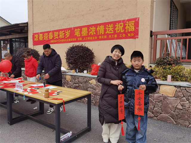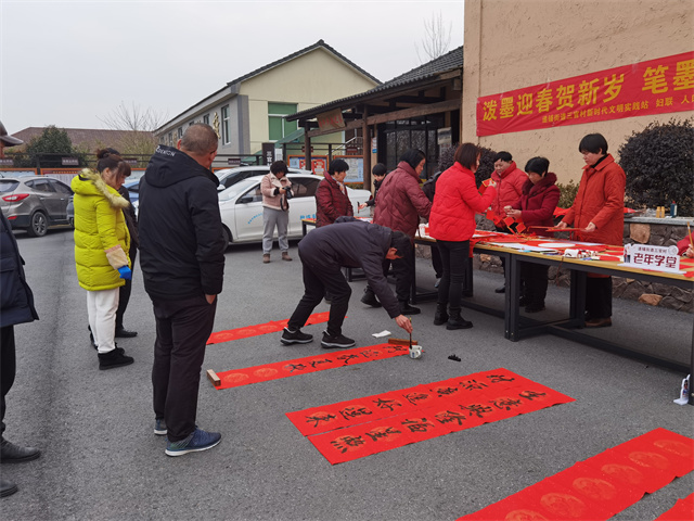 1月27日上午,安吉縣社區教育學院遞鋪分院組織老師赴三官村寫對聯送祝福,邀請了汪華忠,邱立美,盛心武等老師現場書寫福字和對聯。來自三官村的幾十位村民到場領取了新春祝福。