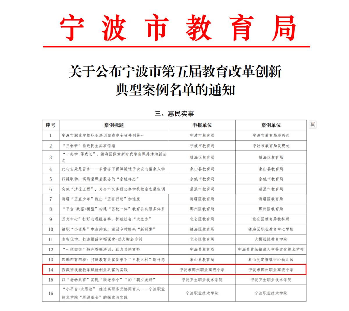 近日,經(jīng)過激烈角逐,寧波市鄞州職業(yè)高級中學(以下簡稱鄞州職高)提交的《西藏班技能教學賦能創(chuàng)業(yè)共富的實踐》案例在全市315篇教育改革創(chuàng)新案例中脫穎而出,獲評寧波市第五屆教育改革創(chuàng)新惠民實事典型案例。
