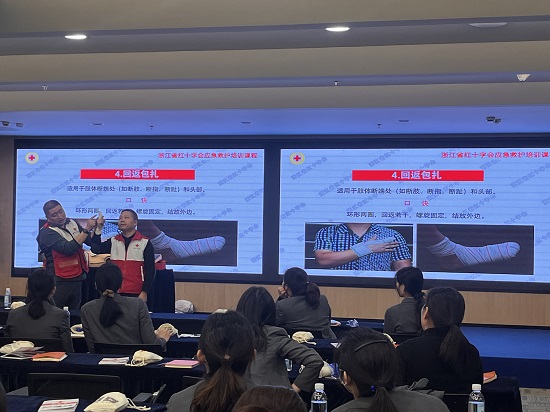 柯橋成校聘請了來自柯橋區(qū)紅十字會的二級救護師莫偉風和薛亞軍為學員們普及應急救護知識。課堂上,老師們采用理論與實踐相結(jié)合的形式,讓學員初步了解了紅十字運動的基本知識和救護技能,用生動、形象的語言示范講解心肺復蘇(含AED使用)、止血包扎、骨折搬運、氣道異物梗阻等,重點演練了心肺復蘇(含AED使用)技巧,強調(diào)了應急救護“黃金四分鐘”的重要性。