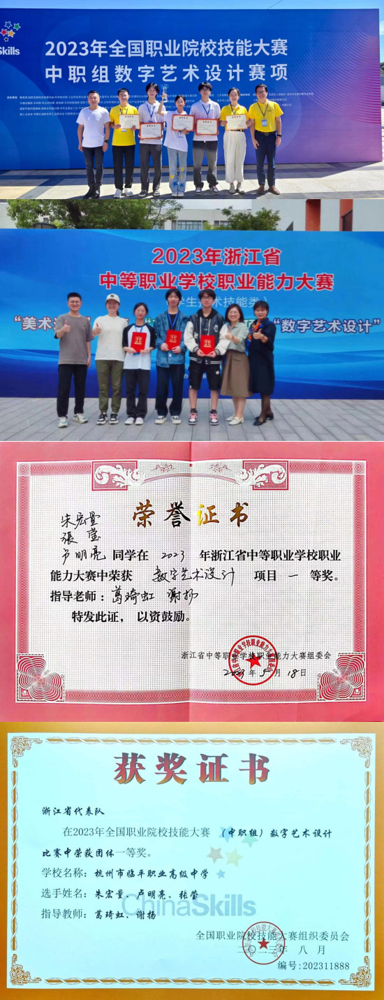 2023年4月,張瑩加入到了職業院校技能競賽中,在團隊中負責新增的數字插畫模塊。由于是第一次有這個模塊,所以張瑩他們并不知道這個項目經歷了大改革后,會有什么不同,或是有什么側重的方面。張瑩和她的團隊日日訓練,次次調整,經歷了夜以繼日的一個月高強度訓練,終于在2023年5月18日,團隊取得了浙江省職業院校技能大賽的數字藝術設計賽項一等獎。