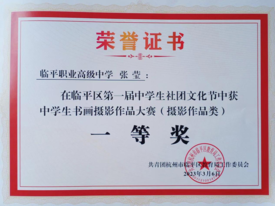 張瑩熱愛繪畫和攝影,并利用課余時間參加了眾多相關競賽,均獲得優異成績,如:2023年3月6日,獲得臨平區第一屆中學生社團文化節中學生書畫攝影作品大賽的攝影作品類一等獎、繪畫類三等獎。