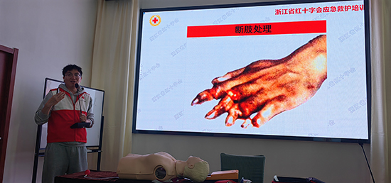 “當身邊意外發(fā)生時,掌握必備的急救技能,關鍵時刻能救人一命……”紅十字會講師王寶峰利用PPT,通過淺顯易懂的語言和現(xiàn)場示范、互動的方式,為學員講解紅十字運動知識、救護概念、創(chuàng)傷救護、氣道異物梗阻、心肺復蘇和AED、突發(fā)事件和常見意外傷害等方面的知識。