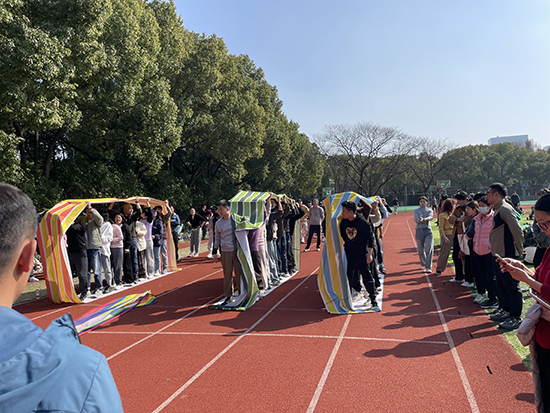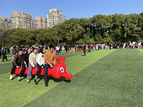 首先進行的項目是“車輪滾滾”,全體隊員進入履帶內,隨著裁判一聲令下,隊員們配合默契,帶動履帶快速向終點沖刺,現場氣氛相當熱烈。緊接著是“同舟共濟”項目,學院八名教師兩兩組隊,各持一塊海綿墊,你追我趕,好不熱鬧。最后緊鑼密鼓開展“趣味毛毛蟲接力”環節。學院小分隊精心地排兵布陣,在“一二,一二!”整齊號子聲中大步向前,一路遙遙領先。