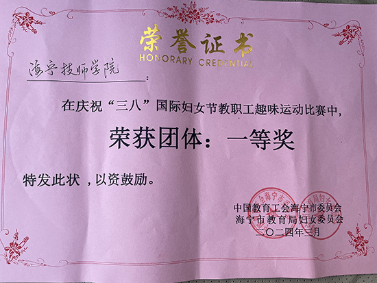 為進一步激勵女教職工們團結協作、奮發向上,展現女教職工們的靚麗風采,3月3日下午,海寧技師學院學院組建代表隊積極參與了由中國教育工會海寧市委員會、海寧市教育局婦女委員會共同舉辦的“揚帆啟航新征程 巾幗奮進譜新篇”表彰活動暨慶祝“三八”國際婦女節教職工趣味運動比賽,并且再創新高。