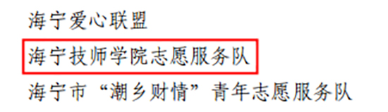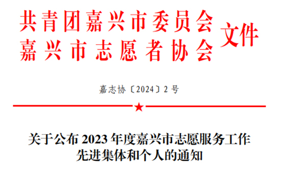 近日,共青團嘉興市委員會、嘉興市志愿者協會聯合發布了《關于公布2023年度嘉興市志愿服務工作先進集體和個人的通知》,海寧技師學院志愿服務隊榜上有名,獲評2023年度嘉興市優秀志愿服務集體!全嘉興市僅有27個集體、海寧市僅有3個集體獲此殊榮。