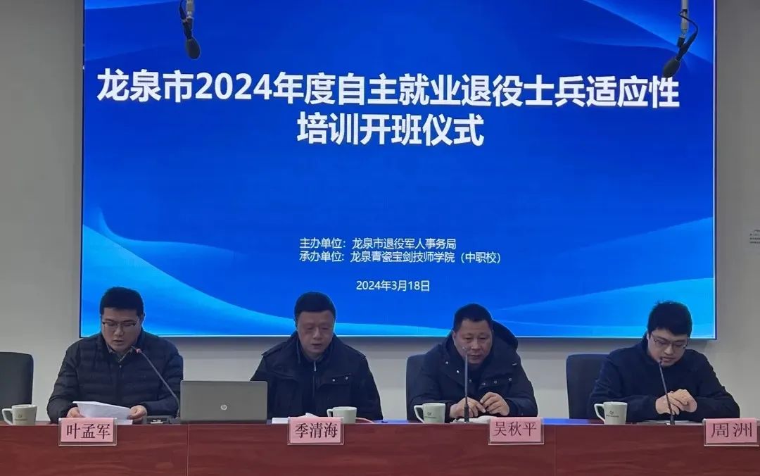退役軍人作為黨和國家的寶貴財富,是建設中國特色社會主義的重要力量。為全面落實國家、省、市各級關于退役軍人適應性培訓工作的要求,幫助退役軍人提高就業創業的質量,盡快了解地方就業創業政策,實現高質量的就業創業,3月18日至21日,龍泉市2024年春季退役軍人適應性培訓班暨返鄉大會在龍泉青瓷寶劍技師學院(中職校)順利舉辦。龍泉市退役軍人事務局、龍泉市人武部、龍泉青瓷寶劍技師學院(中職校)相關領導出席參加活動,21位退役軍人參加培訓。