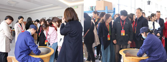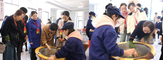在校茶旅工的制茶實訓室內,大師工作室的成員們正忙著炒制新采摘來的鮮葉,活動現場,茶香四溢,沁人心脾。代表們紛紛駐足圍觀,好奇詢問,并嘗試著動手實踐。“原來鍋的溫度這么高,太不容易了。”實踐才知手工炒茶的不易。