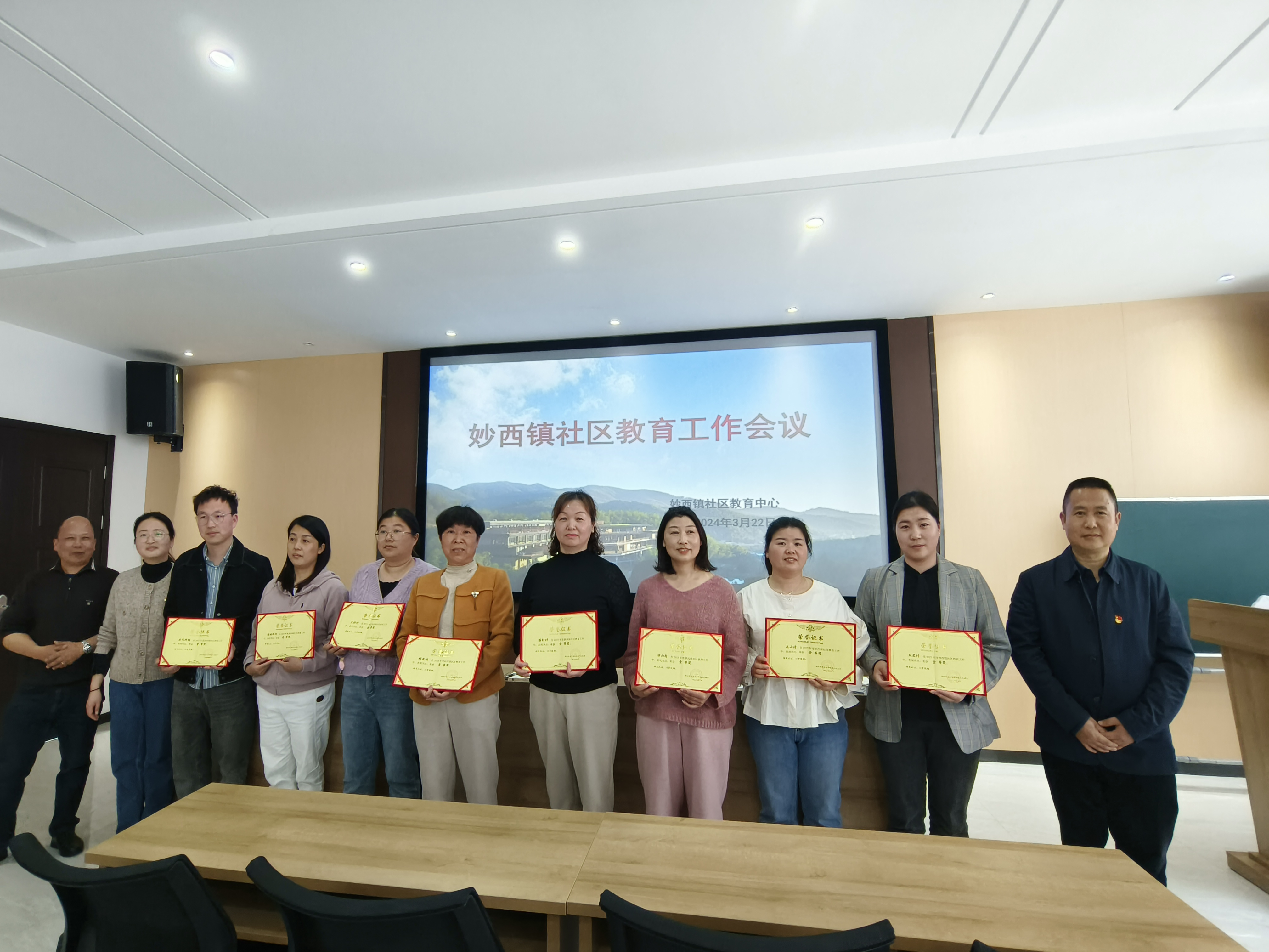會議進行了2023年度社區教育工作表彰頒獎儀式,妙西鎮黨委委員周春華、妙西鎮成人文化技術學校校長朱春明為考核優秀的行政村代表現場頒獎并合影留念。頒獎儀式樸素而莊重,飽含著對各行政村2023年努力奮進所獲成績的充分肯定,也彰顯著在2024年繼續團結合作譜寫社區教育新篇章的強大信心。