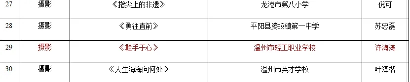 近日,浙江省、市藝術(shù)節(jié)的獲獎結(jié)果相繼公布,溫州市輕工職校的許海濤同學(xué)在胡李秀老師的指導(dǎo)下憑借卓越的才華,優(yōu)秀的眼光在藝術(shù)節(jié)的競技盛宴中獲得了一道閃耀的榮譽獎?wù)拢跀z影比賽類目中榮獲二等獎。
