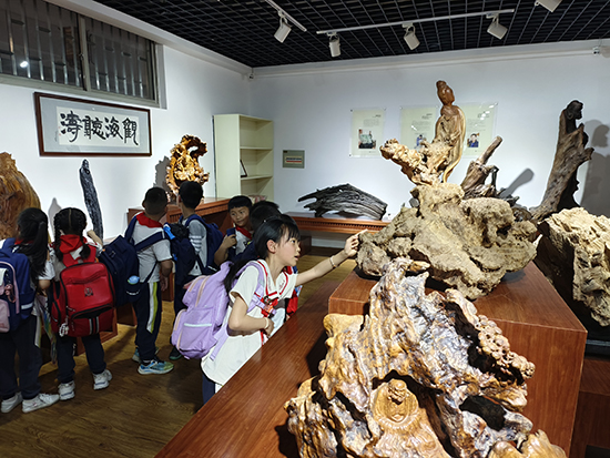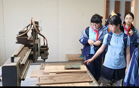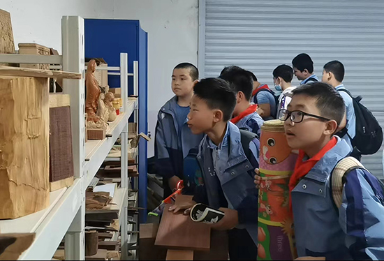 在學(xué)校的民間工藝精品館里,一件件獨(dú)具匠心的根雕、竹編、紫砂藝術(shù)作品贏得了小朋友們的“哇”聲一片。這些作品有的出自名家之手,有的是我校師生的作品,無(wú)聲地彰顯著特色專業(yè)的風(fēng)采。大家還一起走進(jìn)木雕實(shí)訓(xùn)室,見(jiàn)證一塊不起眼的木頭被精雕細(xì)琢成靈秀作品的過(guò)程。極具嵊州地域特色的非遺技藝之美,以木相傳,潛移默化間浸潤(rùn)少年的心,種下藝術(shù)審美的種子。