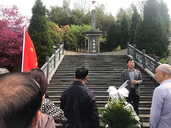 一行人來到陵園祭掃烈士墓。楓橋鎮退教分會主任胡國勝在陵園前作《天地英雄氣 千秋尚凜然》的講話。著重介紹了洄村十九英烈之一周達(1913-1947)的革命事跡。胡國勝指出:“今天,我們來這里祭奠革命先烈,是為了追尋英雄足跡,繼承先烈遺志,弘揚民族精神,激發愛國情懷,增強責任感和使命感;目的就是要通過祭掃烈士墓活動喚起后人對革命先烈的追思和敬慕,體驗感恩之心,講好紅色故事,汲取先輩的精神力量,為中華民族的振興而奮斗!”