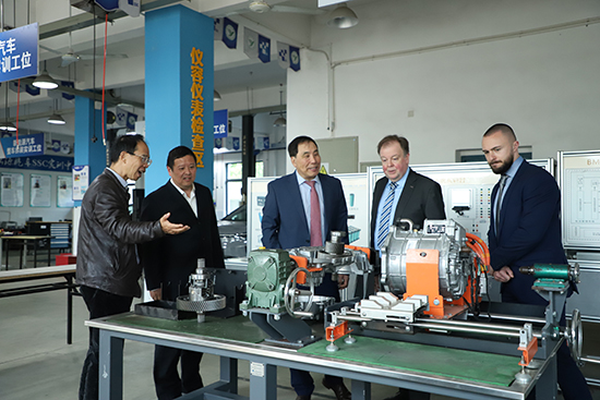 在校長張武劍的帶領下,卡爾一行參觀了校園,并與學生親切交談。隨后,卡爾校長一行參觀了學校新能源汽車實訓室、汽車機電維修名師工作室、工業機器人綜合實訓室等實訓場地,了解了學校專業建設水平和實訓室建設等成果。