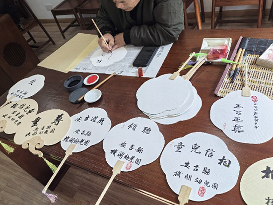 最具創意的環節是,學員們在孩子們的扇面畫上題寫了安吉游戲的關鍵詞,如“發現兒童”“尊重兒童”“相信兒童”“愛”“傾聽”“投入”等。這些詞匯不僅是對安吉游戲理念的提煉,也是老人們對孩子們的寄語和期望。通過這種獨特的方式,老年書法與安吉游戲實現了完美地融合,共同展現了文化的傳承與魅力。