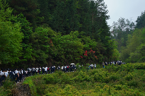 此次拉練途經(jīng)新嶺村、河坑村、西弄村、梅壟水庫,最后返回學(xué)校。一路風(fēng)景宜人,美不勝收。青山溪流旁,花草樹木間,拉練隊(duì)伍以兩路縱隊(duì)前進(jìn)。同學(xué)們?cè)谕局屑で槎瑁瑒?dòng)情而唱,志氣高昂,熱情飽滿。綿延的隊(duì)伍猶如一條長(zhǎng)龍,成為山林間最亮麗的風(fēng)景線。