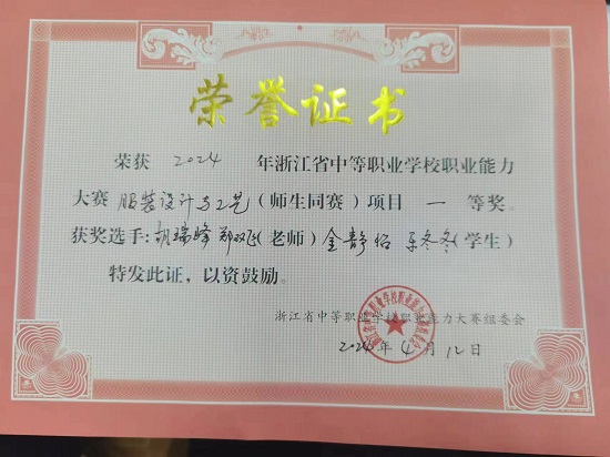 在4月11日至12日舉辦的2024年浙江省中等職業學校職業能力大賽“服裝設計與工藝”(師生同賽)項目比賽中,由北侖職高服裝專業教師胡瑞峰、鄭雙飛,21級服裝中高班學生金靜怡、樂冬冬組成的北侖職高代表隊,經過激烈角逐,以絕對優勢獲得大賽第一名。
