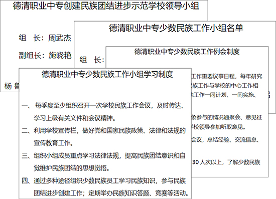 為進(jìn)一步推進(jìn)民族團(tuán)結(jié)建設(shè)工作,2018年,由德清縣民宗局牽頭,德清職業(yè)中專成立了“民族工作室”,設(shè)立民族服務(wù)站、民族服務(wù)熱線、黨員幫扶活動(dòng)室、民族文化展臺等,同時(shí)也通過民族團(tuán)結(jié)友誼林、民族文化長廊、宣傳窗、照片墻、心愿箱等促進(jìn)民族團(tuán)結(jié)工作,推動(dòng)校園文化與民族文化的交匯融合。經(jīng)過實(shí)踐經(jīng)驗(yàn)的不斷積累與總結(jié),德清職業(yè)中專在民族團(tuán)結(jié)建設(shè)工作中逐漸積淀出獨(dú)具特色的工作模式。