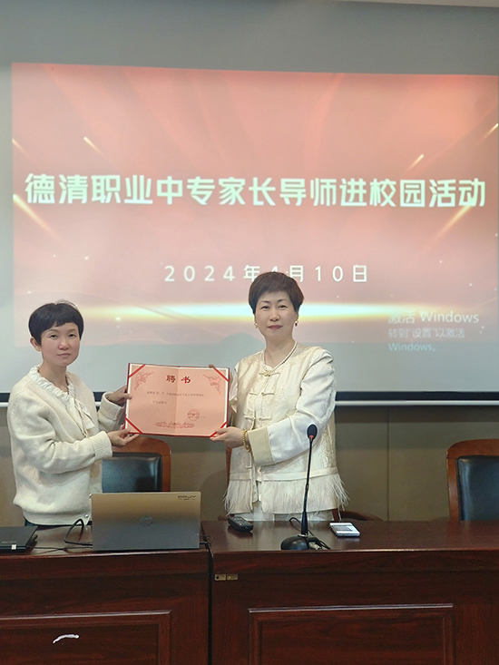 和風細拂春意暖,潤物無聲育新苗。為了拓寬學生的知識面,更好地實現家校互動,4月10日,德清職業中專經貿信息系開展“家長導師進校園”活動。本次活動由校學生處副處長、經貿信息系政教負責人姚宏主持,她對家長導師作了介紹,并頒發家長導師聘書。