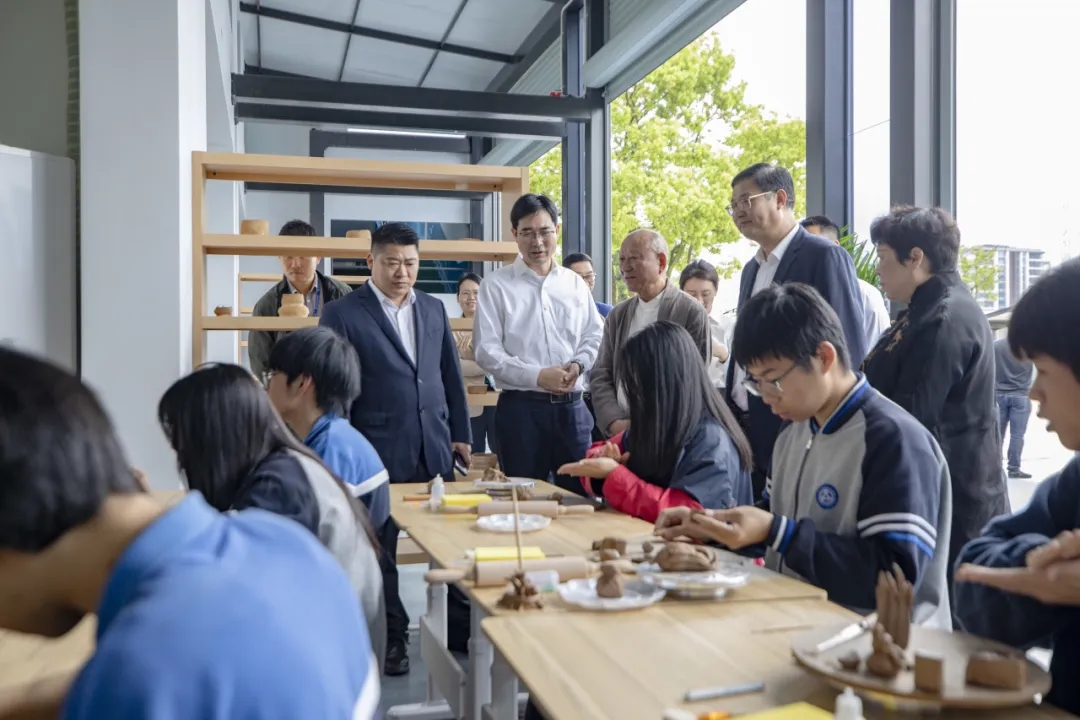 學校黨委書記、校長李忠躍和婺窯大師陳新華、花藝大師何小紅一同為大師工作室揭牌