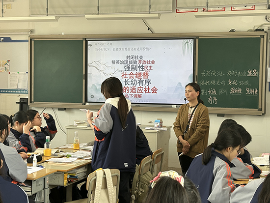 海鹽縣理工學校朱菱芳老師展示了公開課《走進鄉土,追根溯源——“長老統治”閱讀》,她通過新穎的教學方式、豐富的視頻資源和深入的講解引導,使學生理解了社會繼替、教化權力和長老統治等概念,并激發了他們對鄉土文化和社會現象的思考。