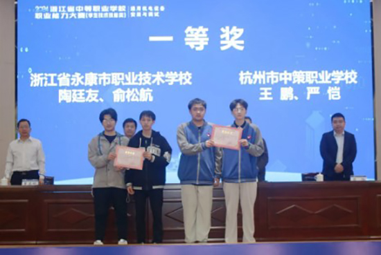 經過激烈角逐,永康職技校與杭州中策職業學校榮膺省一等獎,同時產生4名二等獎、6名三等獎。學校參賽隊伍機器人211班陶廷友,自動化210班俞松航(指導老師:陳富龍,黃李懷),榮獲浙江省一等獎(第一名),成功入選國賽。倪志明、夏其明、曹李民、周煒等領導出席閉幕式并為獲獎選手頒獎。