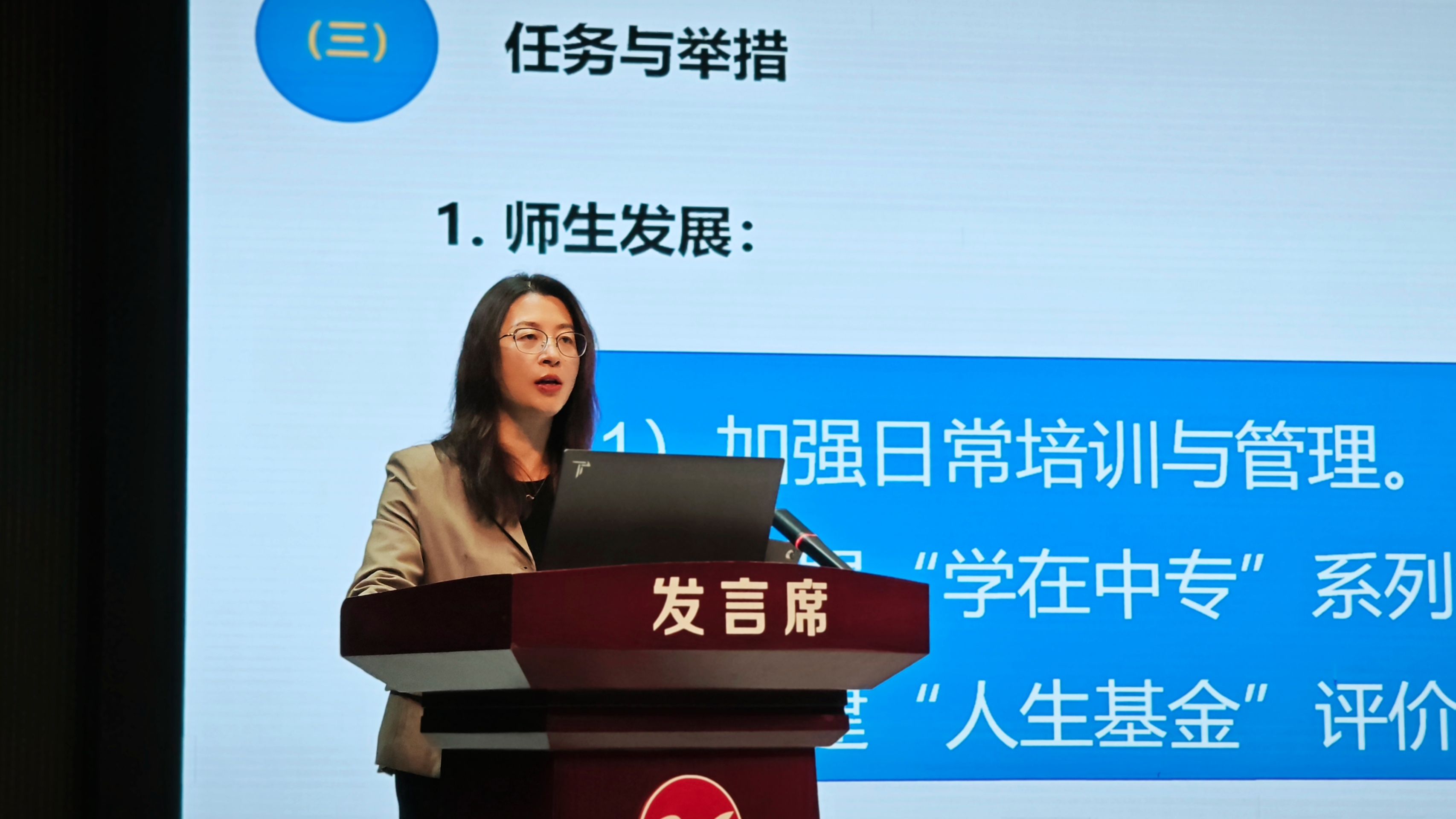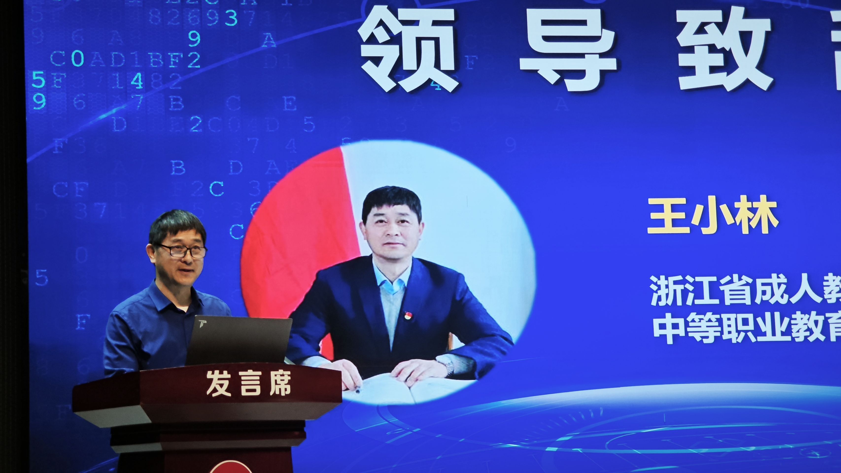 杭州市中策職業學校校長楊瓊飛發表了題為《數字賦能·助推學校高質量發展》講話,從“學校基本概況”“數智賦能建設”“建設成效特色”以及“改革突破與展望”四大版塊,向與會人員分享了學校數字化建設的寶貴經驗。楊校指出,中策職校以創新發展、爭先創優為導向,加快創建以大數據為特色的智慧教育示范區,構建學校智慧教育發展新格局。中策人始終牢記習近平總書記的囑托,大力推動教育數字化建設,打造中等職業教育信息化標桿校,助推人才培養高質量發展。