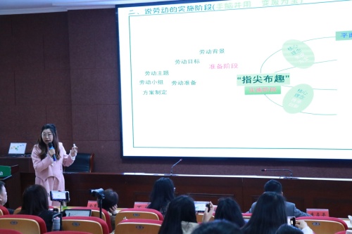 下午她又進行了《勞動教育項目化實施探索》講座,圍繞著“素養導向下勞動課程設計與實施的迭代升級”、“基于任務群的勞動項目單元整體教學探略”、“勞動項目設計與實施的五個關鍵”、“指向真實問題解決的勞動跨學科學習”四個方面展開。戴老師的講座內容新、案例精、立意高,學員們聽后深受啟發。