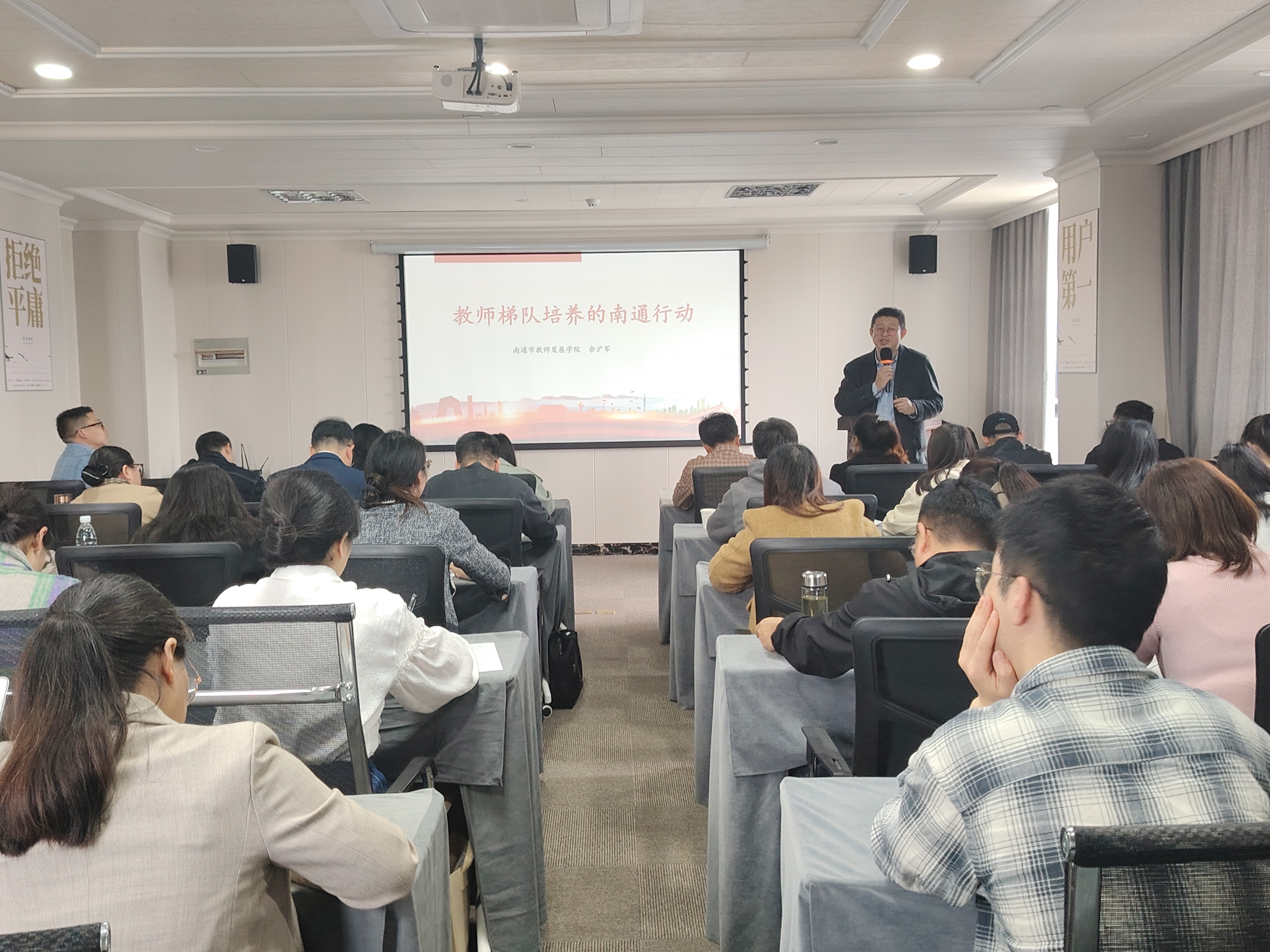 南通市教師發(fā)展學(xué)院副院長(zhǎng)余滬軍作《教師梯隊(duì)培養(yǎng)的南通行動(dòng)》專題講座,余院長(zhǎng)立足“南通教育的歷史”、闡釋“新時(shí)代“強(qiáng)師計(jì)劃”的豐富內(nèi)涵”、探討“新時(shí)代的南通教師隊(duì)伍梯隊(duì)建設(shè)”以及“南通教師隊(duì)伍的培養(yǎng)培訓(xùn)”,以政策解讀+經(jīng)典案例的方式,深入淺出地講解了南通如何進(jìn)行教師發(fā)展的梯隊(duì)培養(yǎng),現(xiàn)場(chǎng)老師反響熱烈,紛紛表示收益良多,課堂效果極佳。