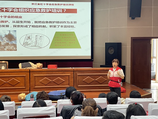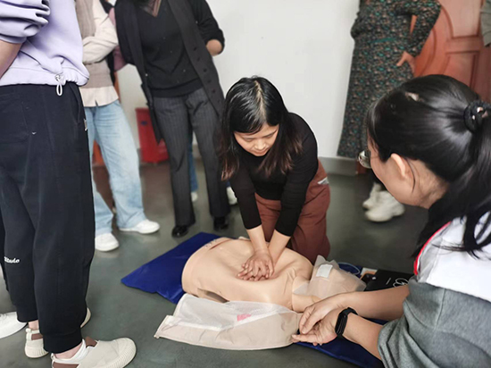 本次活動邀請了多名資深紅十字應急救護師來給大家開展培訓。老師們首先以淺顯易懂的語言,結合實操,將紅十字運動與救護概論、心肺復蘇和AED操作、氣道異物梗阻、創傷救護等知識教授給大家,重點講解了心肺復蘇和AED操作。