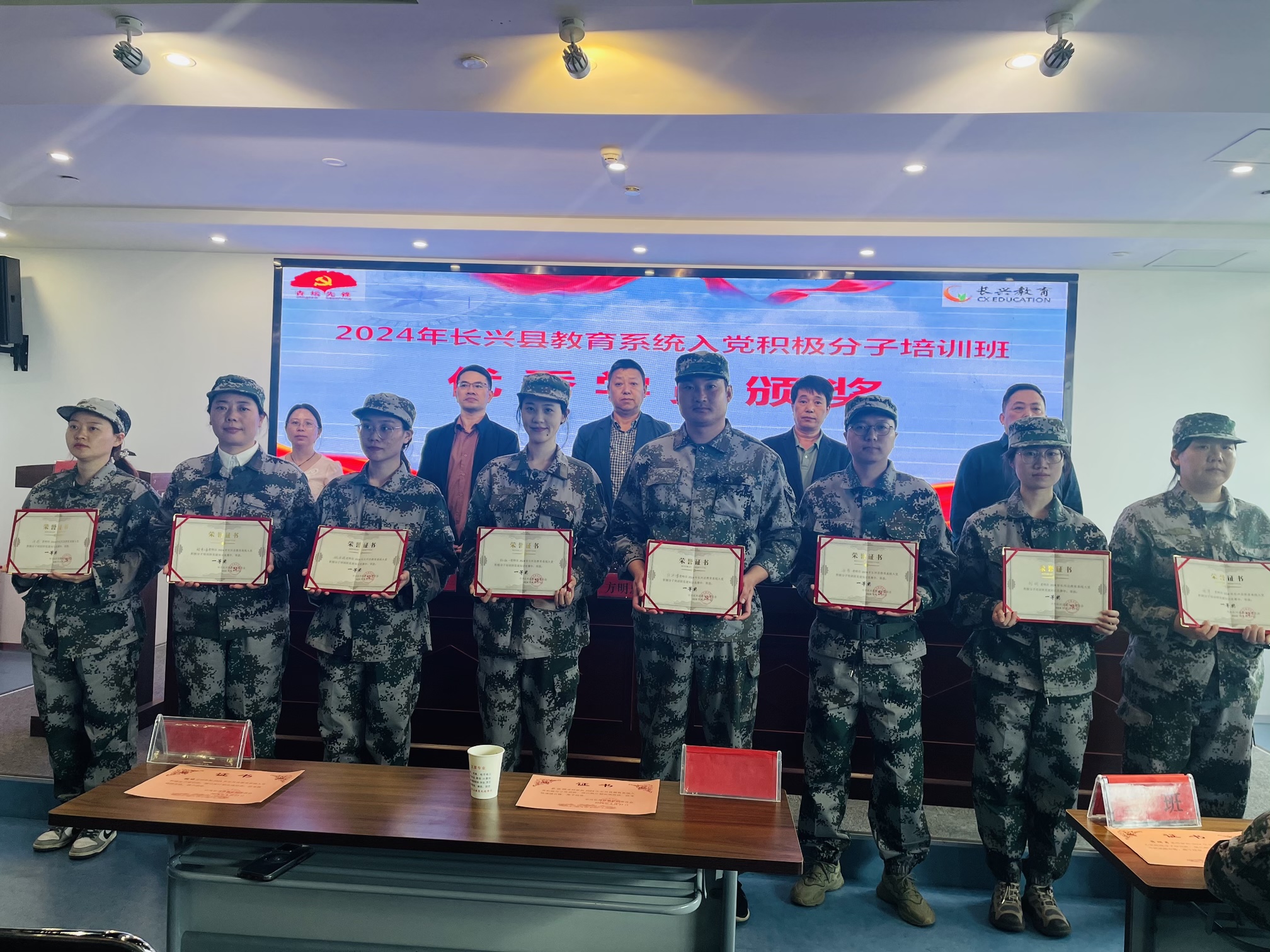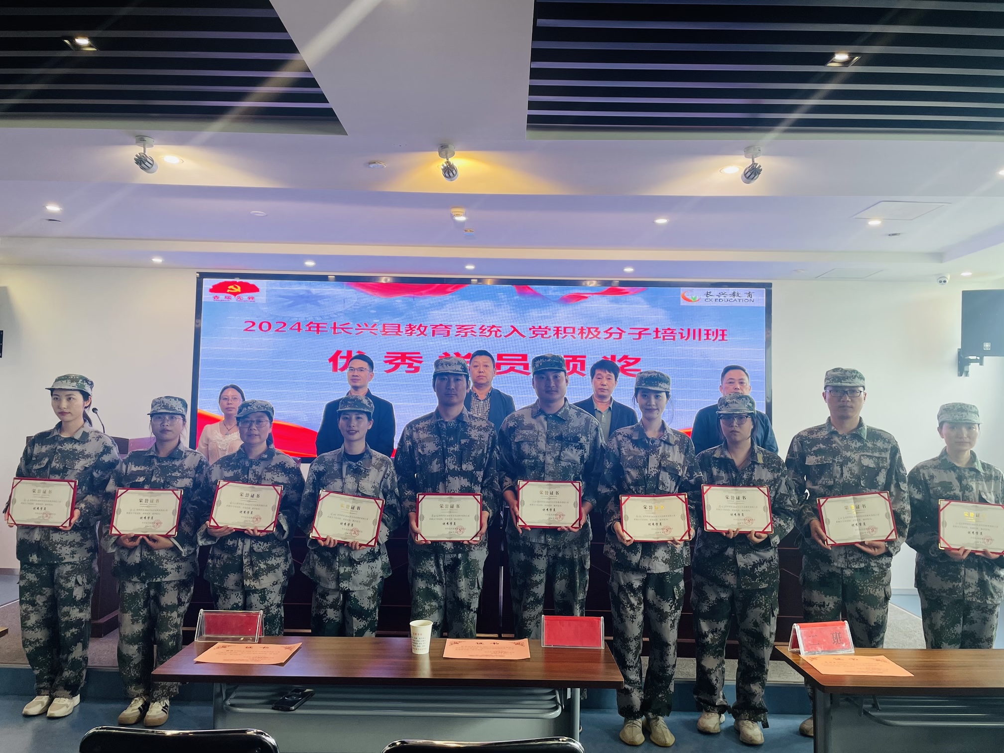 此次培訓課程設置豐富、形式多樣,既有專題講座、黨史知識等理論學習,又有黨史競賽、軍事訓練、拓展拉練等實踐活動。結業儀式上,長興縣教育局機關黨委專職副書記黃牛春進行了黨史競賽獲獎學員、優秀學員頒獎,并對本次培訓給予了高度的評價,他表示學員們能夠在刻苦的訓練中嚴格要求自己,堅定理想信念,端正入黨動機,為成為一名合格的共產黨員打下了堅實的基礎。方明忠科長在結業儀式上再次提出三點希望:一要不斷加強理論學習,二要理論聯系實際,三要進一步端正入黨動機。