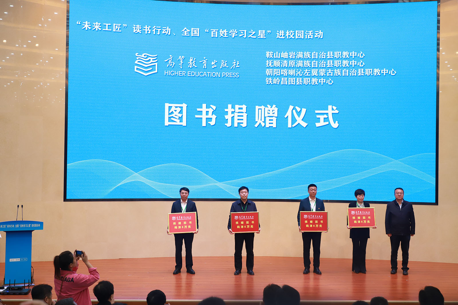 年度事跡特別感人的百姓學(xué)習(xí)之星張華、鐘昀睿與同學(xué)們共享了學(xué)習(xí)、奮斗、進(jìn)步的人生歷程。會(huì)上協(xié)會(huì)副會(huì)長單位高等教育出版社向鞍山市岫巖滿族自治縣等四縣的職教中心各捐贈(zèng)了6萬元碼洋圖書。