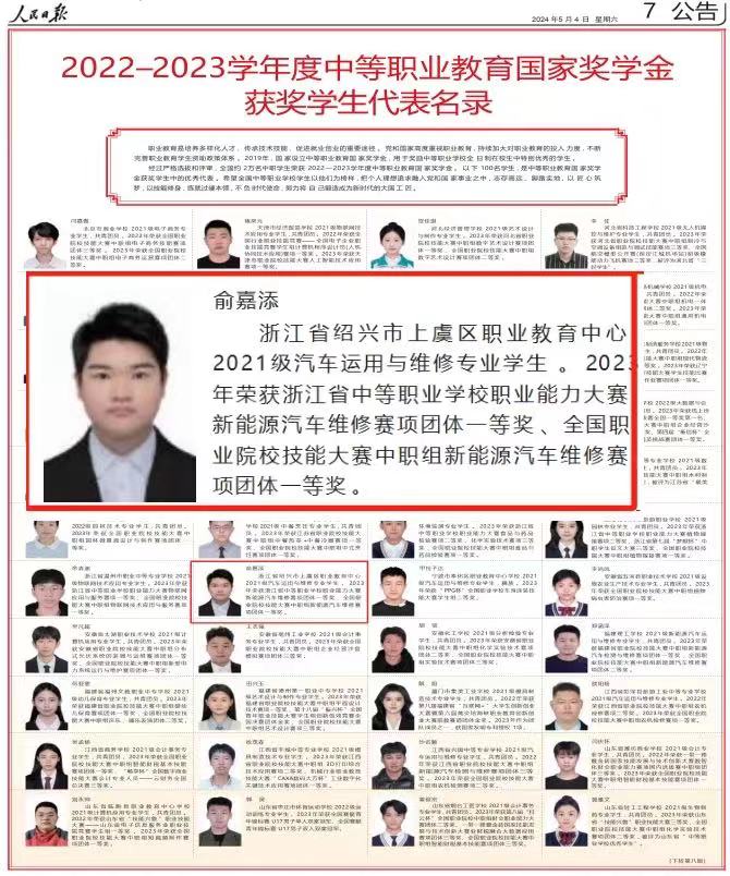 日前,經過嚴格選拔和評審,全國約2萬名中職學生榮獲2022—2023學年度中等職業教育國家獎學金。紹興市上虞區職業教育中心2021級汽車運用與維修專業學生俞嘉添同學作為紹興市唯一一位,浙江省四位獲獎學生代表之一,刊登在5月4日出版的《人民日報》年度中等職業教育國家獎學金獲獎學生代表名錄。