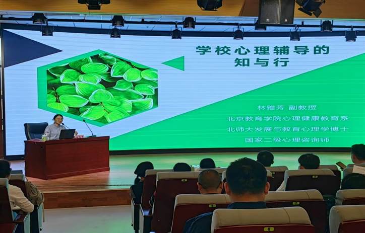 北京教育學院副教授、北師大發展與教育心理學博士林雅芳以《學校心理輔導的知與行》為題作專題講座。她從家庭教育入手,深入淺出地闡釋了學業和生活的關系,強調了“輔導關系”在心理輔導中的重要地位。針對當今中小學生的情緒問題,林雅芳教授通過案例分享,為大家介紹了提高學生抗挫折能力的方法和途徑。