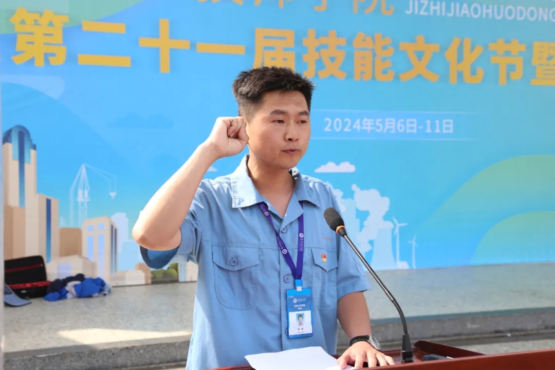 第 47 屆世界技能大賽國家隊隊員、中華人民共和國第二屆職業技能大賽工業機械項目全國第五名、全國技術能手獲得者機電工程學院19機電班同學鄭濤代表選手宣誓:嚴格遵守競賽紀律,尊重裁判,尊重選手,服從安排,聽從指揮,以良好的精神面貌、較好的技能水平、頑強的拼搏精神,賽出成績,賽出水平,賽出風格!