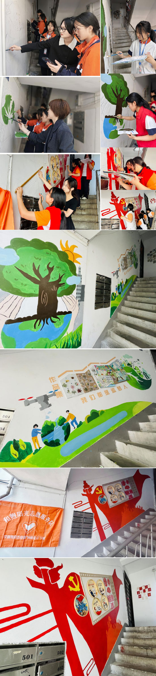 在教師志愿者的協(xié)助下,學生對樓道進行設(shè)計、彩繪。從課堂到居民樓,學生志愿者用手中的畫筆和心中的創(chuàng)意把社區(qū)樓道裝點得美觀且富有生氣,讓原本單調(diào)的社區(qū)居民樓道變成了傳播政治思想理念,培育生態(tài)環(huán)保意識的“墻上陣地”。