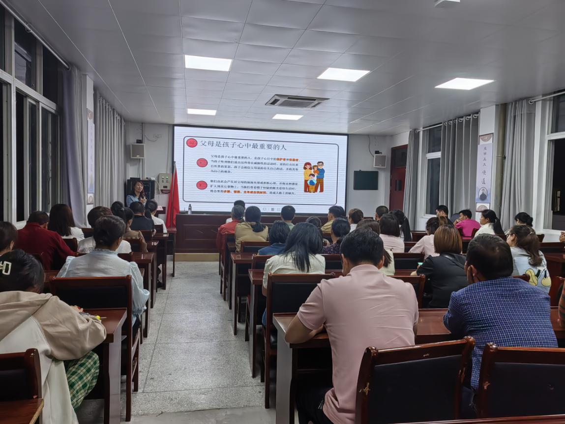 啟動儀式后,縣心理健康教育名師、家庭教育指導師范長花開展題為《有效的親子溝通》講座,她通過當今孩子是否快樂、溝通要點、溝通絆腳石、快樂溝通十方法四個方面,結合自己與孩子的溝通教育情況,分享自身經驗。同時通過列舉生活中有效溝通的典型例子,教給家長一些科學方法和常用法寶。在互動環節中,耐心細致解答了農村家長與孩子溝通面臨的現實困惑和難題。