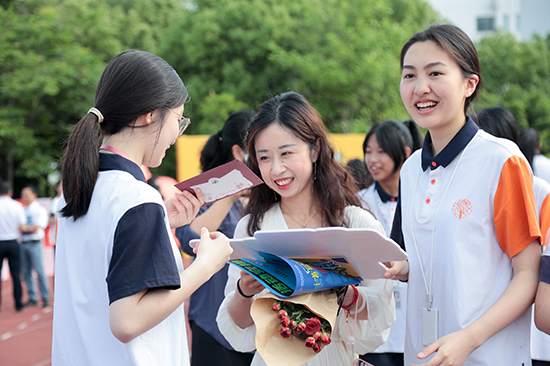 校領導們為入場的班主任送上鮮花和手寫信,各班代表贈送祝福卡片。班主任們懷抱鮮花和祝福,在班級花名冊前駐足簽名并合影,留下這個特殊日子里的珍貴記憶。