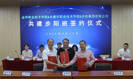為深化職業(yè)院校辦學(xué)內(nèi)涵、拓展校企合作領(lǐng)域、創(chuàng)新校企合作辦學(xué)機(jī)制,5月17日,金華職業(yè)技術(shù)學(xué)院、浙江省永康市職業(yè)技術(shù)學(xué)校、步陽集團(tuán)有限公司三方在永康職技校隆重舉行共建“步陽學(xué)院”的合作協(xié)議簽署儀式。