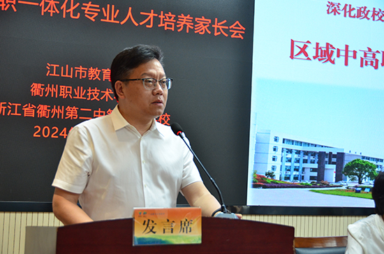 會議伊始,衢州第二中專黨委書記、校長徐凌志致歡迎辭,他對各位嘉賓和家長的到來表示熱烈的歡迎。并以“高品質育人 高質量發展”為主題,向與會者介紹了學校的整體概況,以及在中高職一體化人才培養方面的創新做法。他強調,區域中高職一體化教育模式對于培養具備高素質和專業技能人才至關重要,這不僅有助于學生個人的全面發展,也為區域經濟的持續發展提供了有力的人才保障。他指出,此次家長會是家校溝通的重要平臺,也是共同謀劃區域教育發展的契機。他分享了學校在教育教學、師資隊伍建設、實訓條件改善等方面的努力和成果,并表示學校將繼續致力于打造三省邊際中心縣城職業教育高水平標桿校,不斷提升教育質量,為社會輸送更多優秀的技術技能人才。