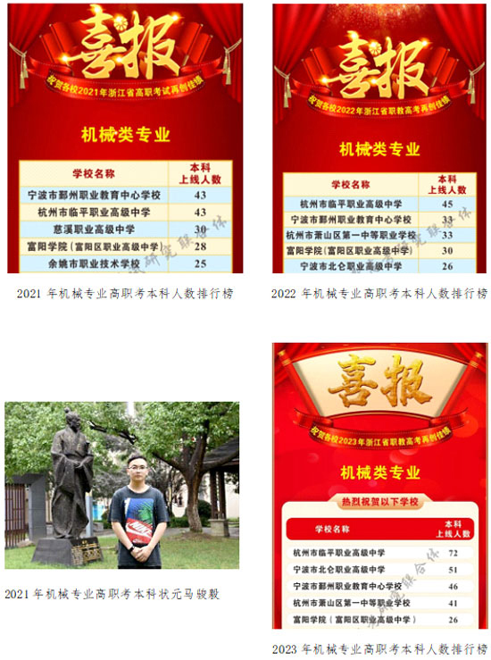 高職考成績卓越。上線率保持在100%,近三年本科上線人數(shù)分別為43、45各72人,連續(xù)三年位列浙江省第一,數(shù)控高職二班馬駿毅同學(xué)勇奪2021年全省狀元。每年有大批學(xué)生進入中國計量大學(xué)、浙江科技學(xué)院、浙江師范大學(xué)、溫州大學(xué)、浙江機電職業(yè)技術(shù)學(xué)院、杭州職業(yè)技術(shù)學(xué)院等知名院校。