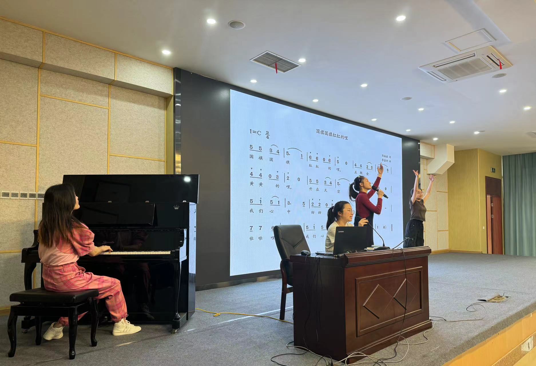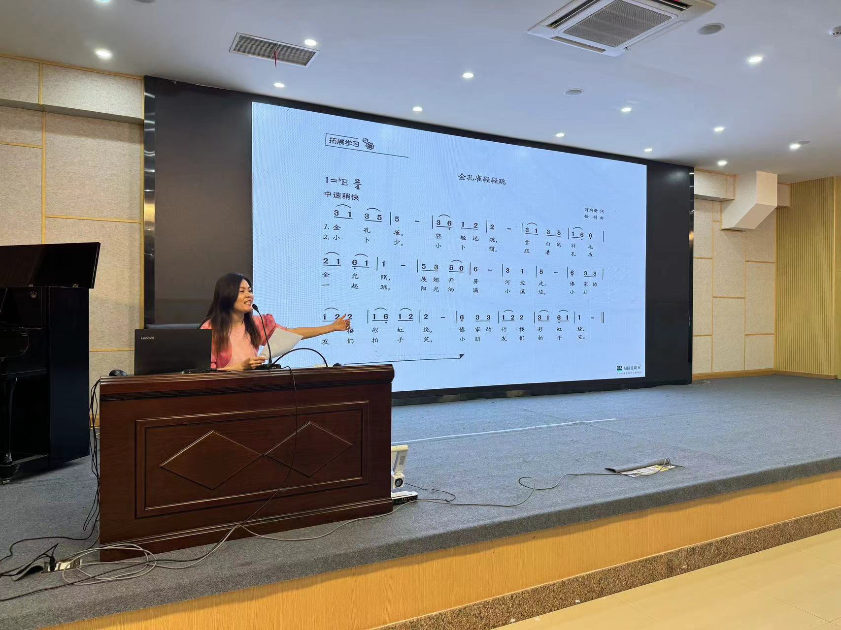 聲樂教師林小芳從《金孔雀輕輕跳》《秋天到》《柳樹姑娘》《國旗國旗紅紅的哩》四首兒童歌曲入手,先讓參加培訓的保育員們掌握歌曲的歌詞,接著一字一句地教學每一句歌詞的音準、音調,用簡單有趣的方式讓大家能更快地學習并記住歌曲的音高,課堂氛圍愉快積極。