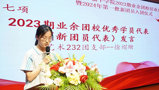 藝術(shù)232徐熠珊作為優(yōu)秀學(xué)員(新團(tuán)員代表)代表發(fā)言,她表示會(huì)用更高標(biāo)準(zhǔn)要求自己,做好一名優(yōu)秀的共青團(tuán)員,并呼吁在場的所有學(xué)員積極提升自我,以飽滿的熱情迎接團(tuán)的考驗(yàn),貢獻(xiàn)自己的青春力量。