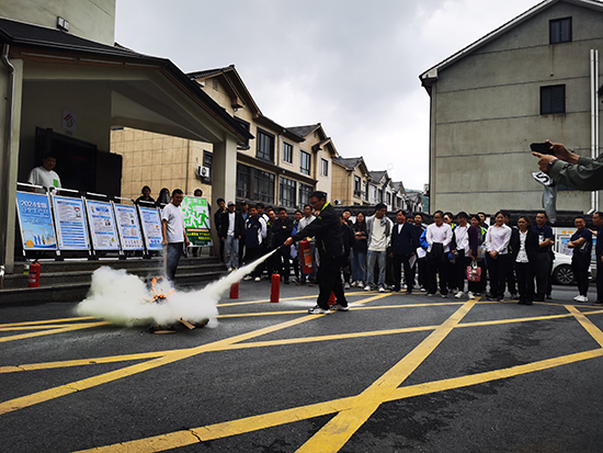 最后,在座的所有員工參加了現場消防演練,并在大禮堂外排隊一個個進行滅火器使用考核。
