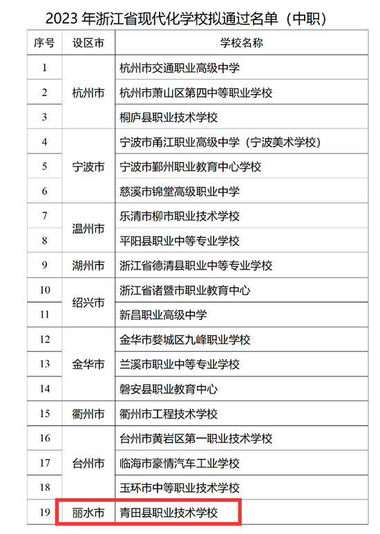 提品質、強內涵,攀高躍階再添新功。2021年,學校啟動現代化學校創建工作。創建以來,學校對標對表開展工作,制定時間表、路線圖,堅持分類施策、精準施策,推進創建工作。2023年11月13日,省現代化學校評估組專家到?,F場評估驗收,對學校創建工作給予高度評價。2023年12月29日,省教育廳、省人民政府教育督導委員會發文公示評估結果,學校成功獲評省中職現代化學校,全省共19所中職學校獲評,麗水市僅1所。這是學校繼成功獲評浙江省中職改革發展示范校、浙江省“三名”工程建設單位、浙江省“雙高”項目建設單位以來,提升學校辦學品質的又一標志性工程。獲評浙江省現代化學校,不僅代表學校硬件的現代化,更體現了學校教育理念的現代化、人才培養的現代化,是當前最能綜合反映學校辦學水平、最具含金量的省級榮譽。