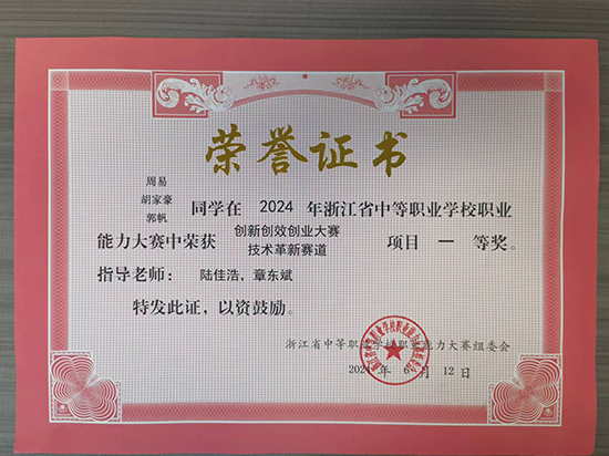 6月11日至12日,2024年浙江省中等職業(yè)學(xué)校職業(yè)能力大賽(學(xué)生職業(yè)素養(yǎng)類)“創(chuàng)新創(chuàng)效創(chuàng)業(yè)”賽項(xiàng),商業(yè)創(chuàng)意賽道和技術(shù)革新賽道決賽在奉化工貿(mào)旅游學(xué)校舉行。海寧技師學(xué)院由周易、胡家豪、郭帆3名選手組成的代表隊(duì)參加技術(shù)革新賽道的決賽。他們?cè)诟鞯厥羞x送的150個(gè)項(xiàng)目中,經(jīng)專家網(wǎng)絡(luò)評(píng)審入圍到一等獎(jiǎng)角逐的23個(gè)項(xiàng)目中,并在現(xiàn)場(chǎng)的路演和答辯環(huán)節(jié)中憑借穩(wěn)定的發(fā)揮,代表學(xué)院斬獲技術(shù)革新賽道一等獎(jiǎng)。